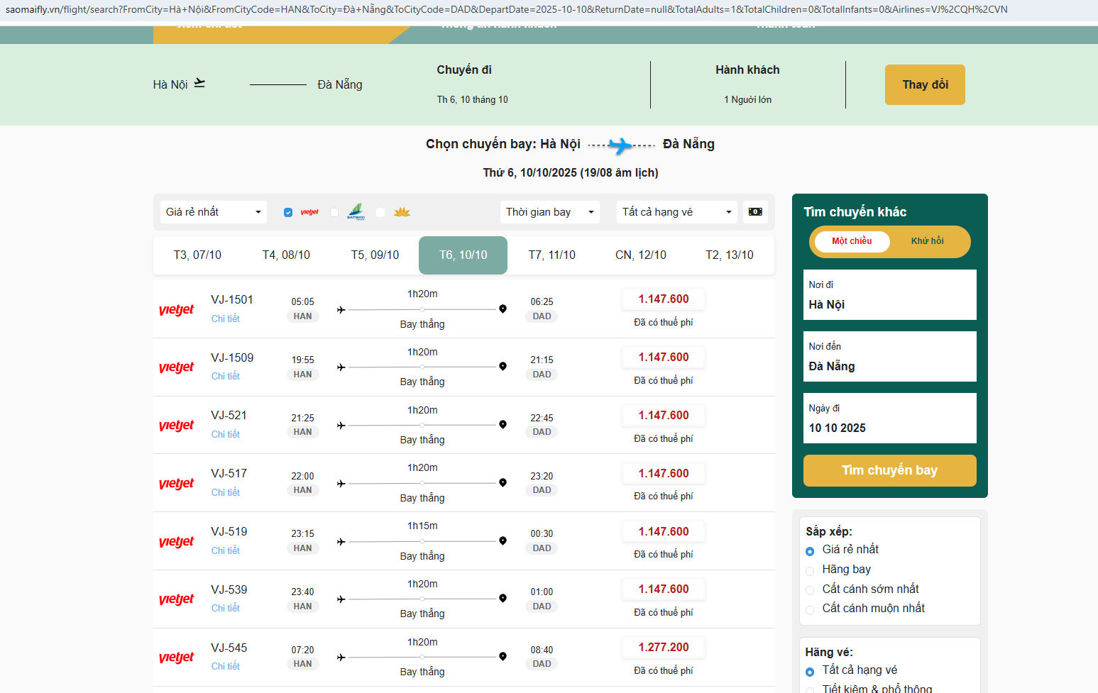 Giá vé máy bay hãng Vietjet Airlines Hà Nội - Đà Nẵng khởi hành ngày vào lúc 05:05 ngày 10/10/2025.