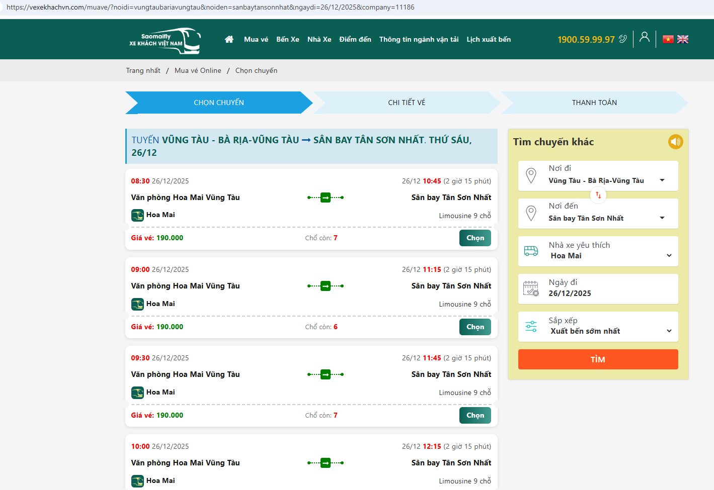 • Chọn tuyến: Vũng Tàu → Sân bay Tân Sơn Nhất