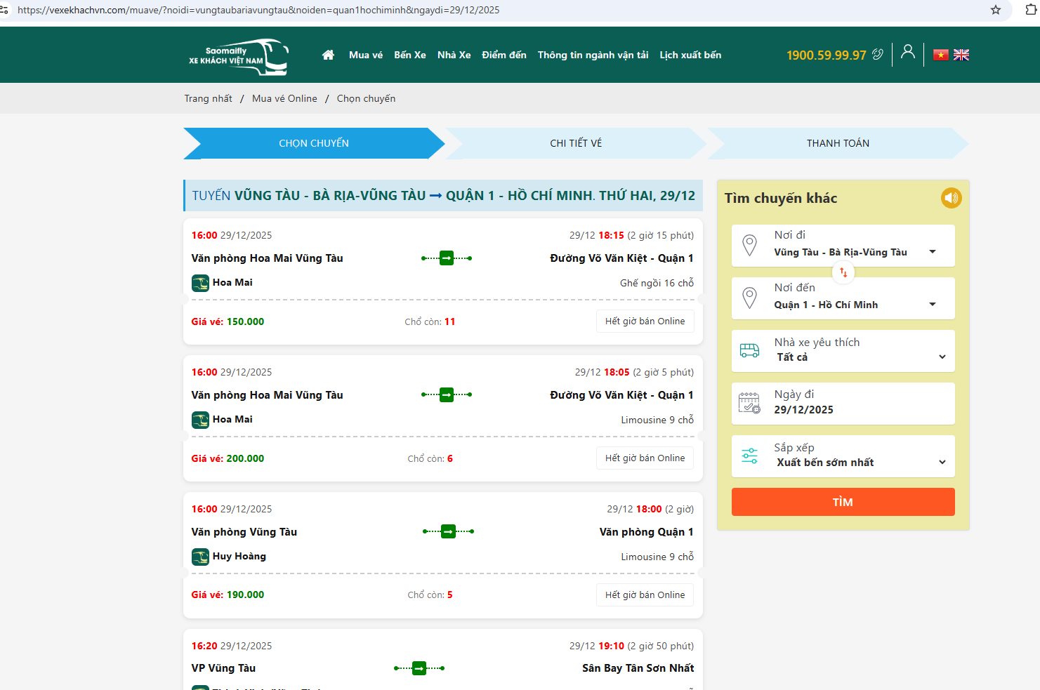 Đặt xe Vũng Tàu đi Sài Gòn Quận 1 online giữ chỗ tại: https://vexekhachvn.com/. Hotline hỗ trợ đặt vé và giữ vé dịp cao điểm: 1900599997.