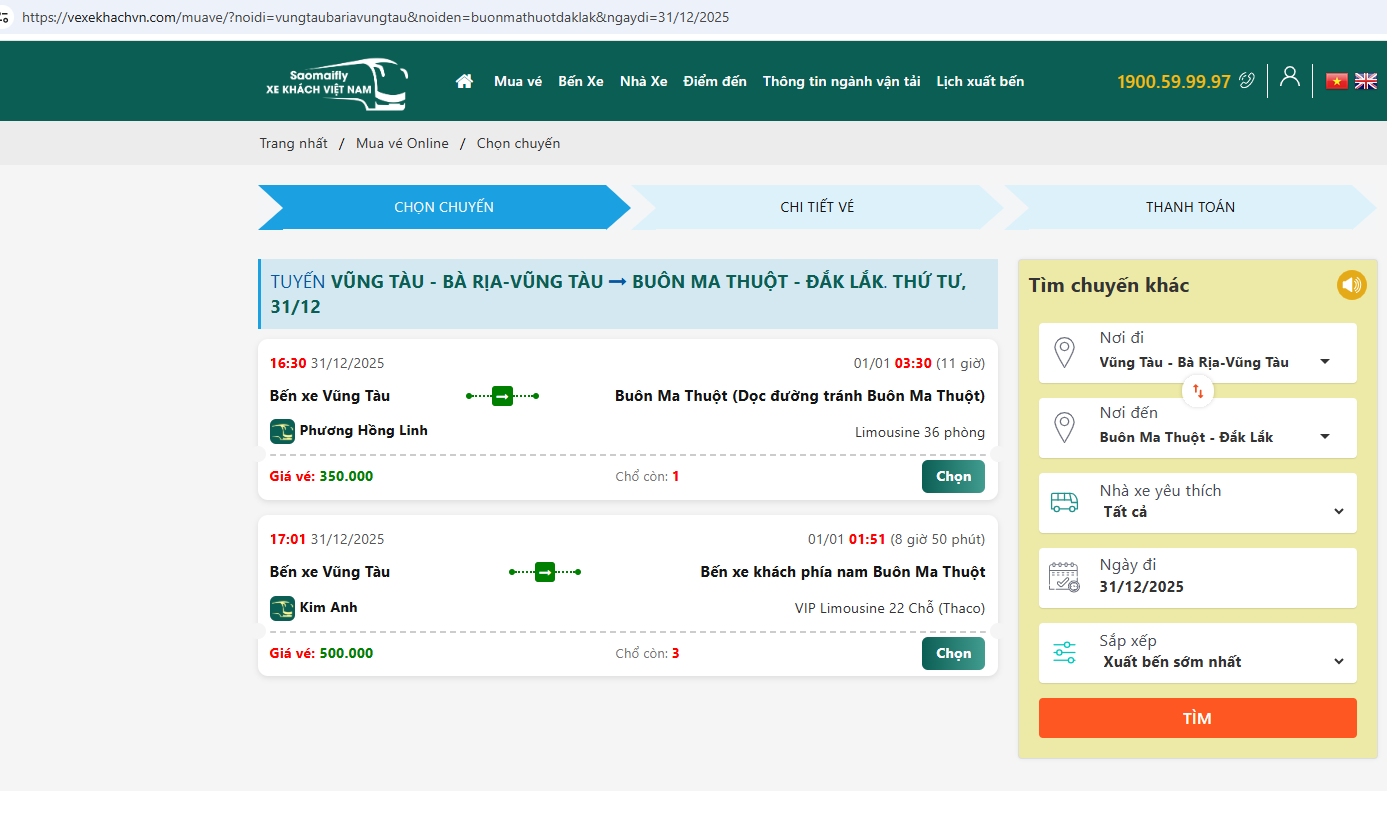 Nếu bạn đang tìm chuyến xe Phương Hồng Linh Vũng Tàu đi Buôn Ma Thuột với lịch chạy ổn định, giá vé rõ ràng và hình thức di chuyển tiện lợi, hãy chủ động đặt vé sớm để đảm bảo chỗ ngồi phù hợp. Việc đặt vé trực tuyến giúp bạn dễ dàng theo dõi thông tin chuyến xe, lựa chọn thời gian khởi hành và chuẩn bị hành trình một cách chủ động hơn.